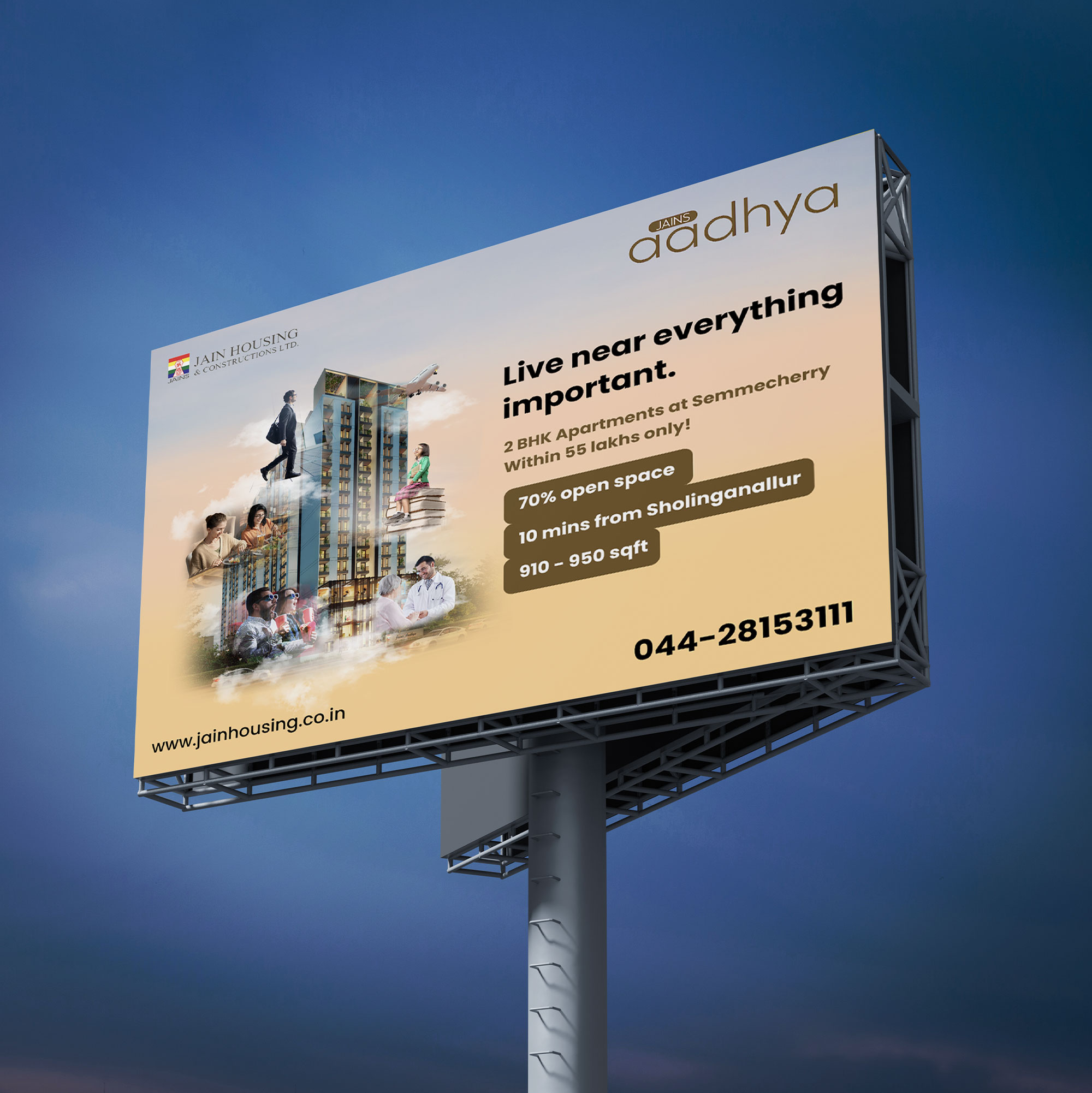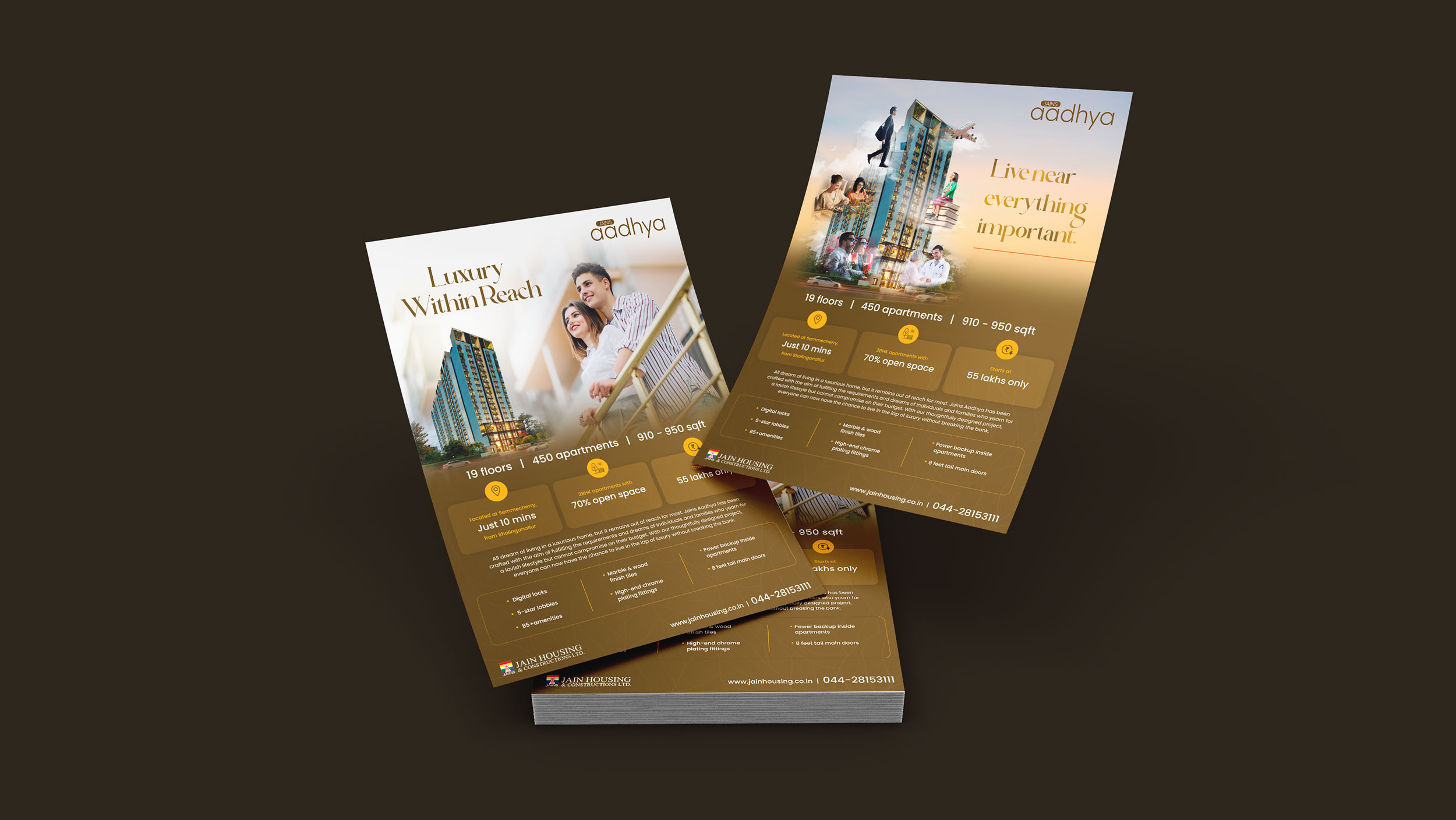 Comprehensive Marketing Collaterals: Our team designed impactful signage, hoardings, newspaper ads, flyers, and brochures that not only stood out but also effectively communicated the unique selling points of the Aadhya project.